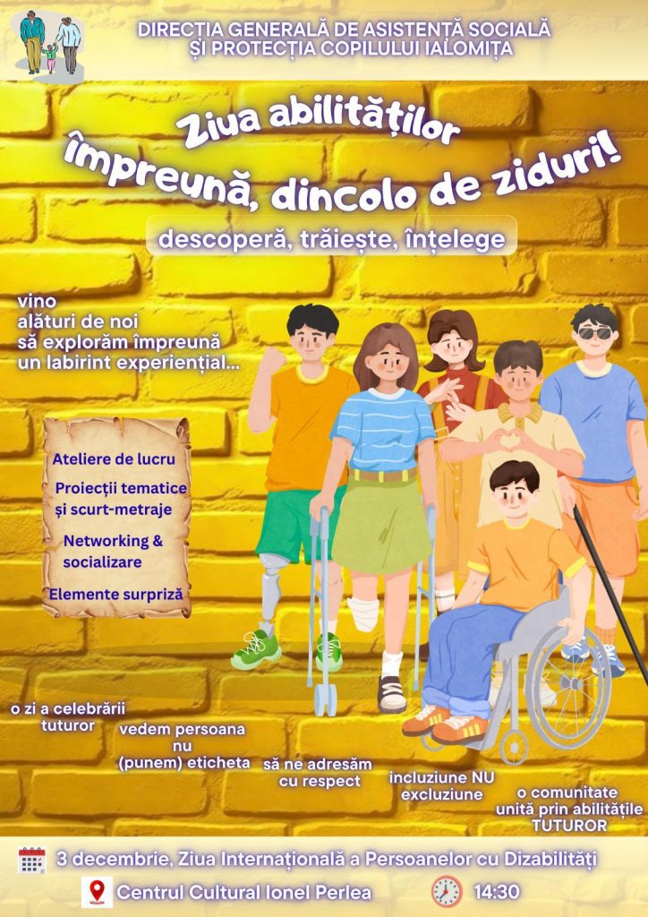DGASPC Ialomița marchează Ziua Internațională a Persoanelor cu Dizabilități prin evenimentul „Ziua abilităților – împreună, dincolo de ziduri!” – descoperă, trăiește, înțelege Pagina principalăAnunțuriDGASPC Ialomița marchează Ziua Internațională a Persoanelor cu Dizabilităț ... Dată articol 3 decembrie 2025 Categorii Anunțuri Sari la navigare ← Anunț organizare concurs pentru ocuparea postului vacant de director general adjunct, funcție contractuală de conducere