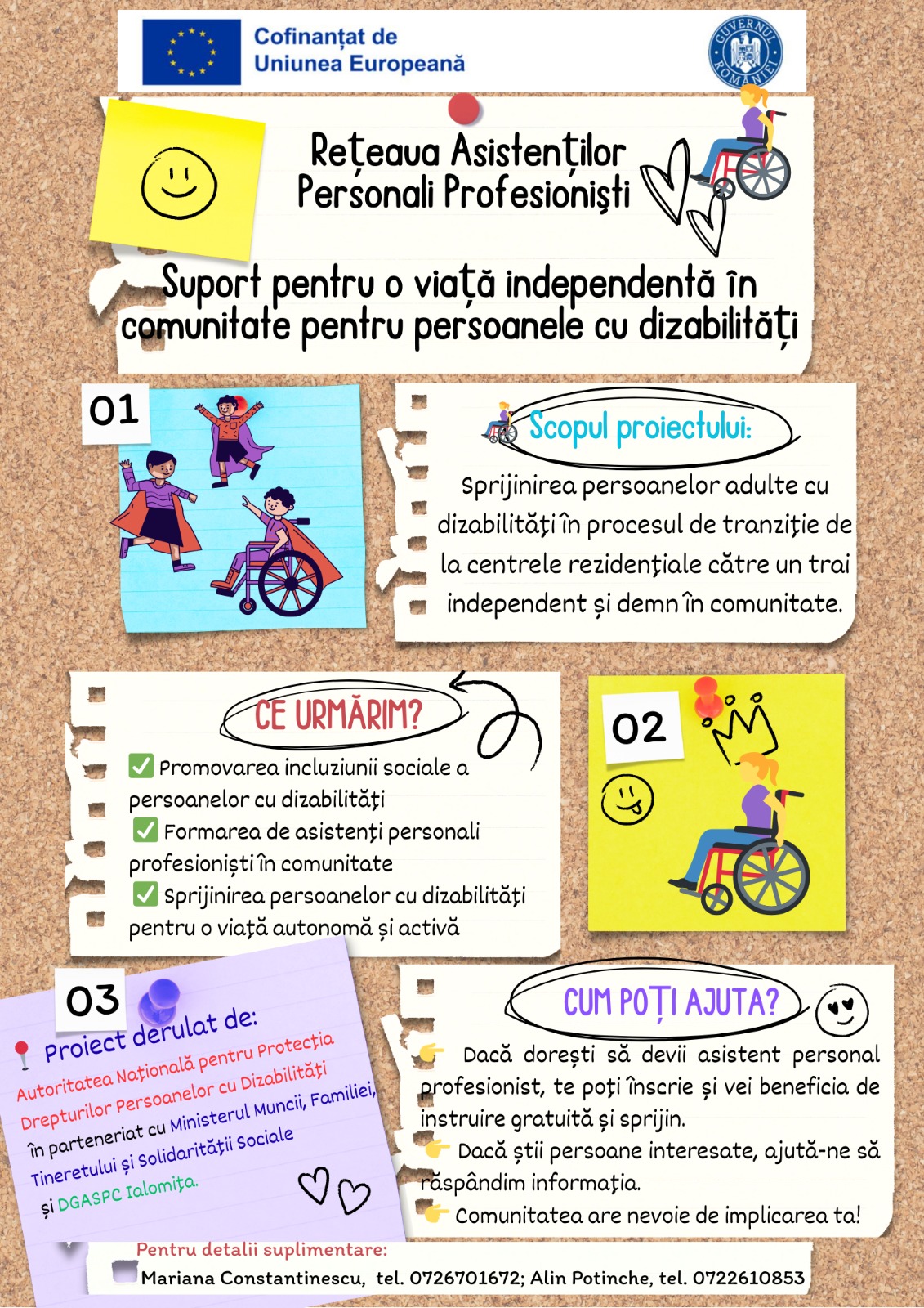 Direcția Generală de Asistență Socială și Protecția Copilului Ialomița, și-a asumat în calitate de partener, formarea și angajarea unui număr de 30 de asistenți personali profesioniști, care vor susține prin activitățile desfășurate, persoane cu dizabilități aflate în prezent în sistemul rezidențial destinat adulților cu dizabilități, subordonat instituției.